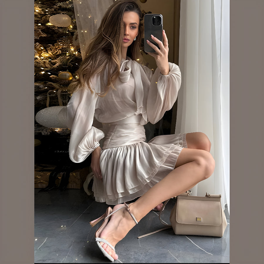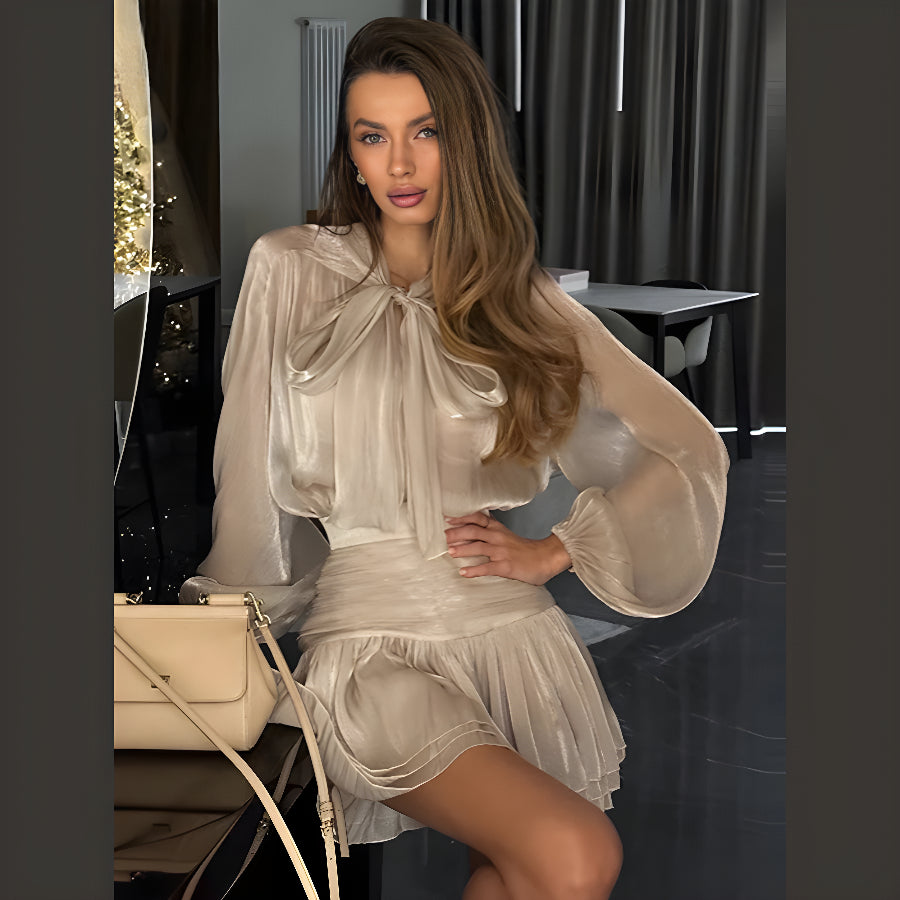 The long-sleeved blouse features an adjustable bow at the neckline, creating a delicate and elegant effect, while the fluid fit enhances the lightness of the fabric. The high-waisted mini skirt with subtle pleats flatters the figure and adds a youthful, striking charm.